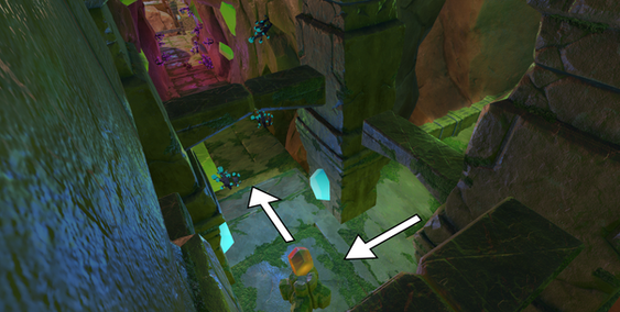 Although initially unable to clear the first jump, the player will traverse back up, allowing a layer of anticipation and rewarding keen-eyed players.